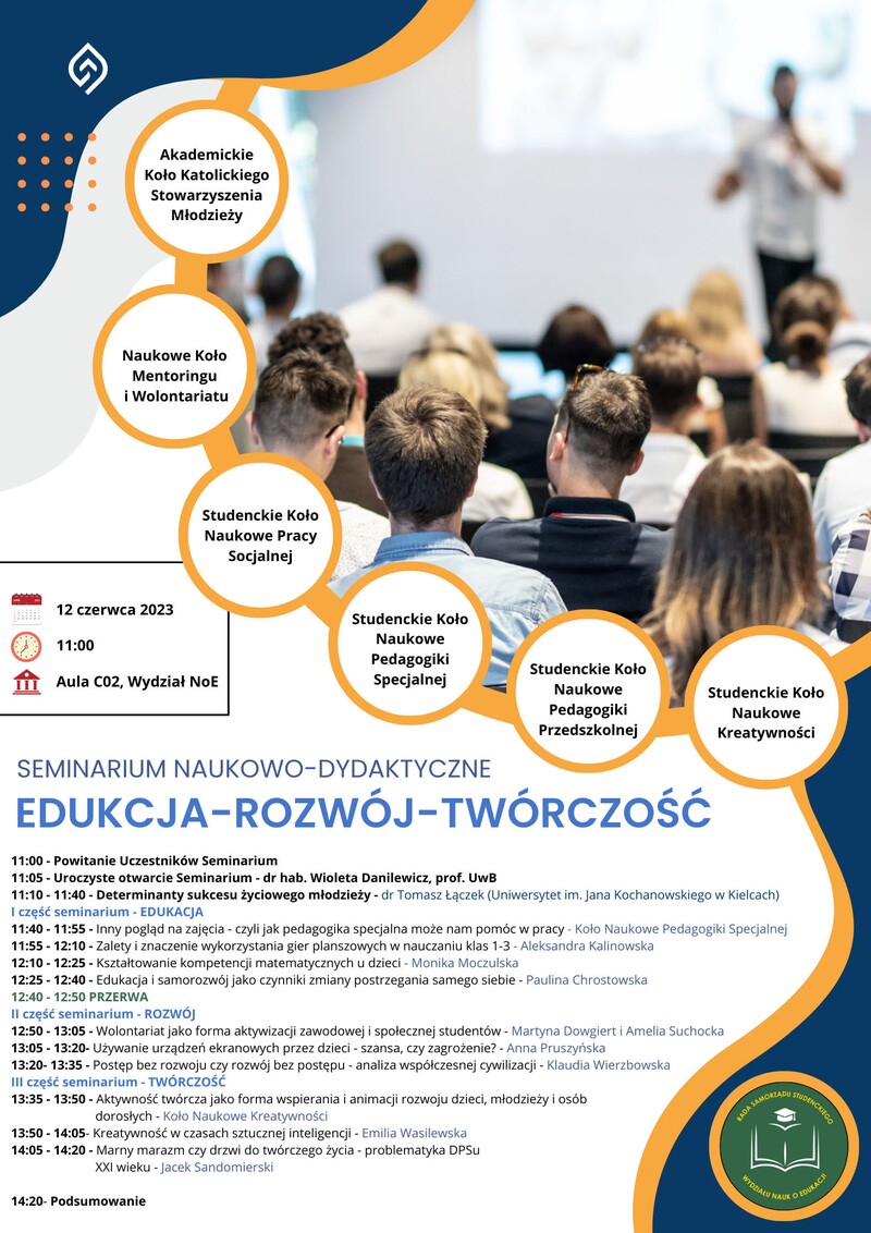 Koło KSM współorganizowało Seminarium Naukowo-Dydaktyczne „Rozwój – Edukacja – Twórczość”, które odbyło się w dniu 12 czerwca 2023 roku; Przygotowanie referatów pt.